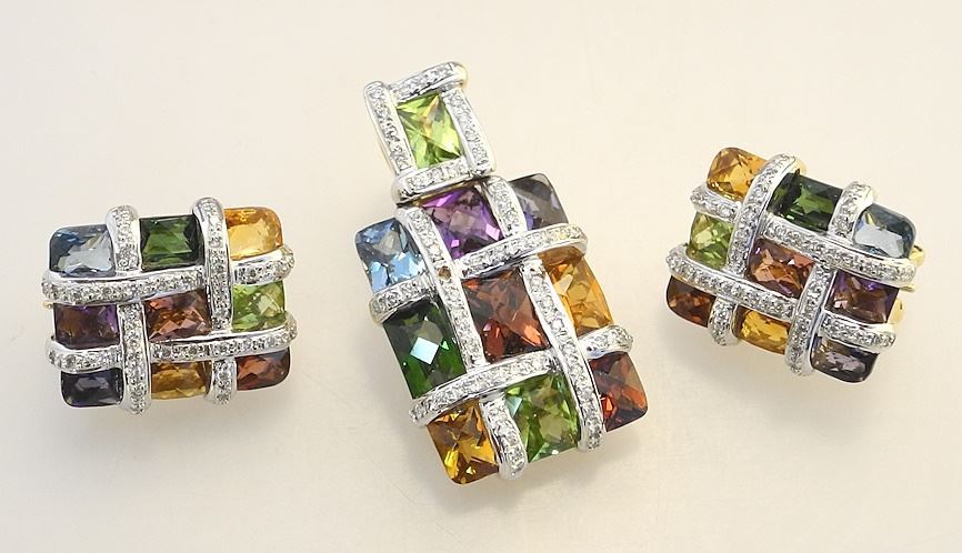Bellarri 18K Yellow Gold & Mosaic Gemstone Earrings & Pendant.