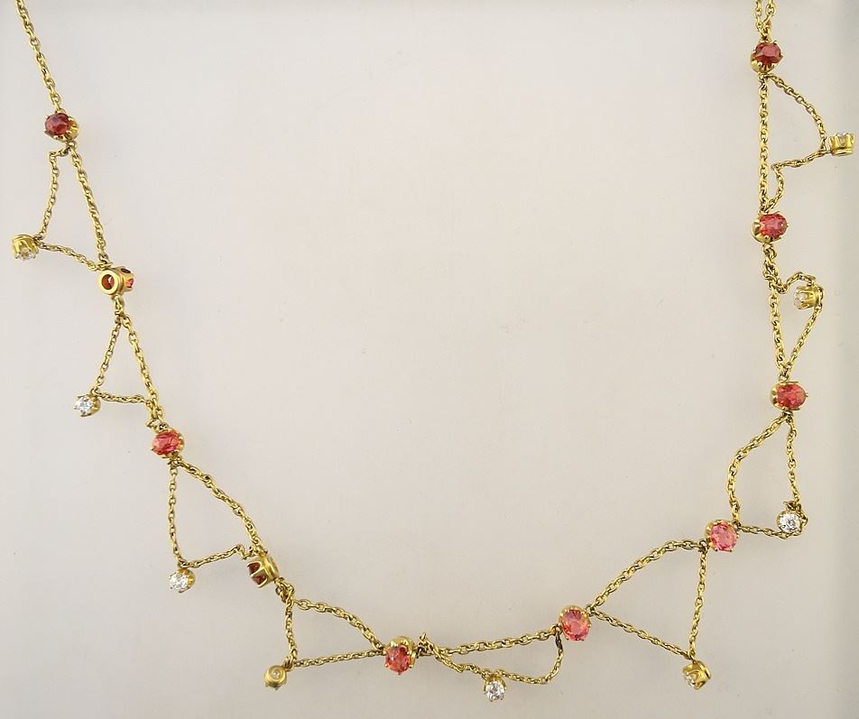 LOT 56 10K Gold Lavalier with Colourless Sapphires & Rubellite Stones, 12 Gms Estimate: $200 - $250 Sold For: $320 Auction Date: Tuesday, February 13 2024 at 4:00 PM