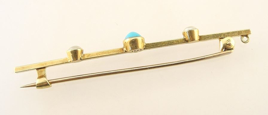 LOT 79 15ct (marked) Yellow Gold Turquoise & Pearl Bar Brooch, 2 1/4"L, 2.68gm. Estimate: $120 - $180 Auction Date: Tuesday, February 13 2024 at 4:00 PM