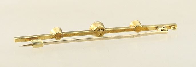 LOT 79 15ct (marked) Yellow Gold Turquoise & Pearl Bar Brooch, 2 1/4"L, 2.68gm. Estimate: $120 - $180 Auction Date: Tuesday, February 13 2024 at 4:00 PM