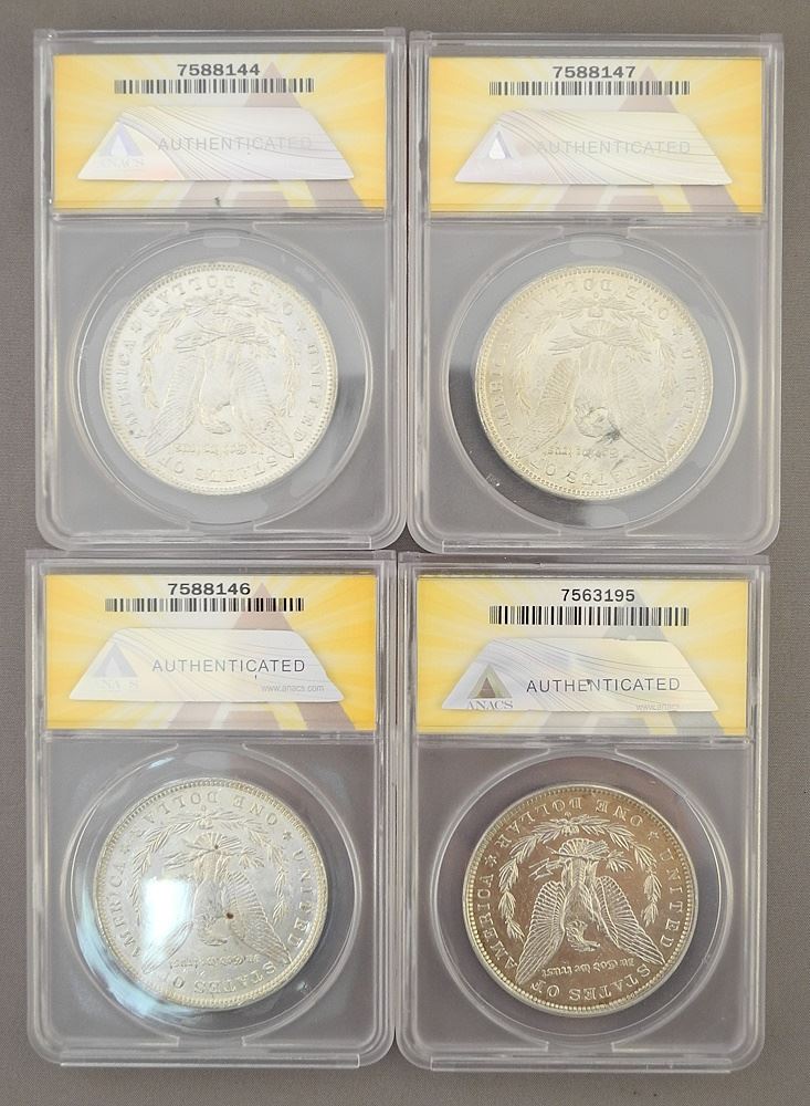 LOT 267 4 Mint State Graded Morgan Silver Dollars, 1884. Estimate: $150 - $250 Sold For: $275 Auction Date: Tuesday, June 18 2024 at 4:00 PM