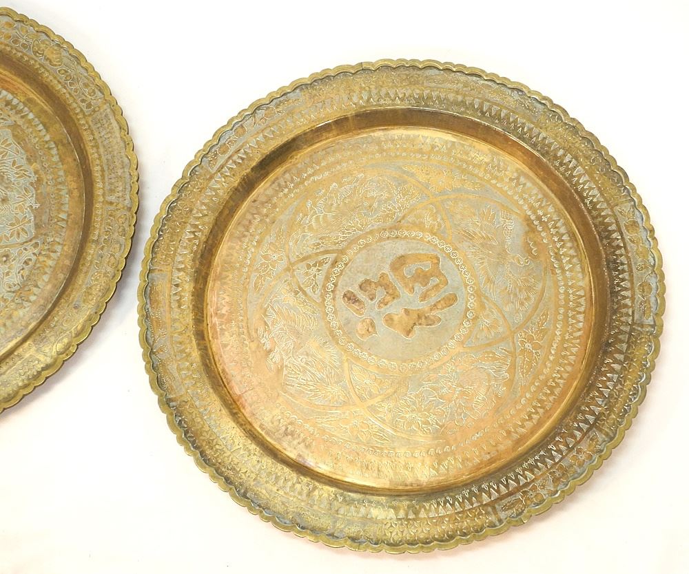 LOT 45 Pair of Brass Chargers with Lucky Characters, 20" Diameter. Estimate: $50 - $100 Auction Date: Tuesday, June 18 2024 at 4:00 PM