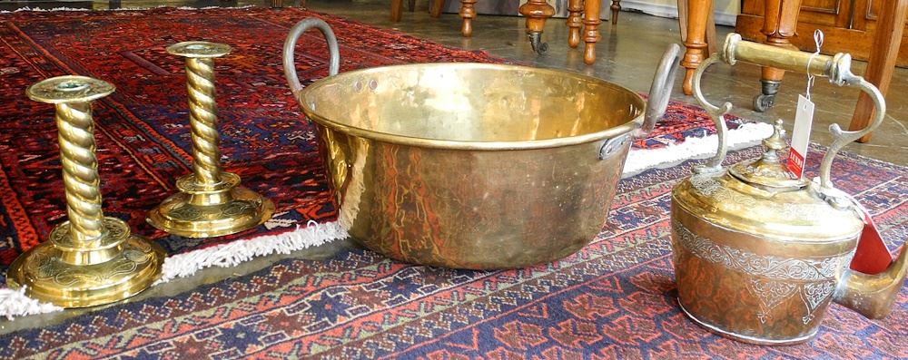 3 Brass Domestic Antiquities: Preserving Pan (17 3/8" Diam) / Kettle / Candle Sticks.