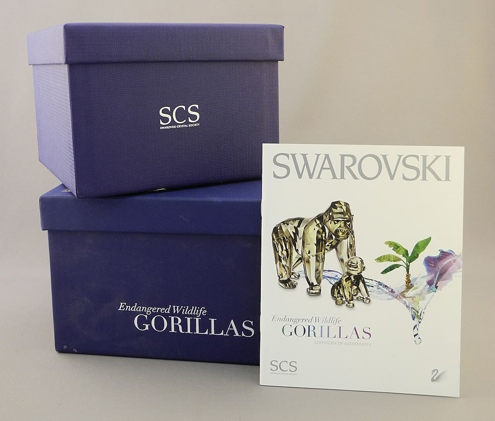 LOT 149 Swarovski Amber Tiger #1003148 (7"L) , Giraffe (#5302151, 5 1/4"h) & Gorilla & Baby, #952504, 4 Estimate: $150 - $250 Sold For: $325 Auction Date: Tuesday, June 18 2024 at 4:00 PM