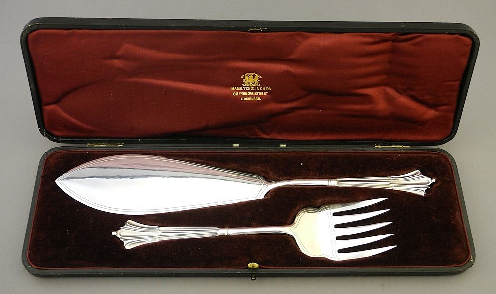 LOT 199 Pair of Scottish Electroplated Fish Servers in Original Box, 14 1/4"w. Estimate: $80 - $100 Sold For: $140 Auction Date: Tuesday, June 18 2024 at 4:00 PM