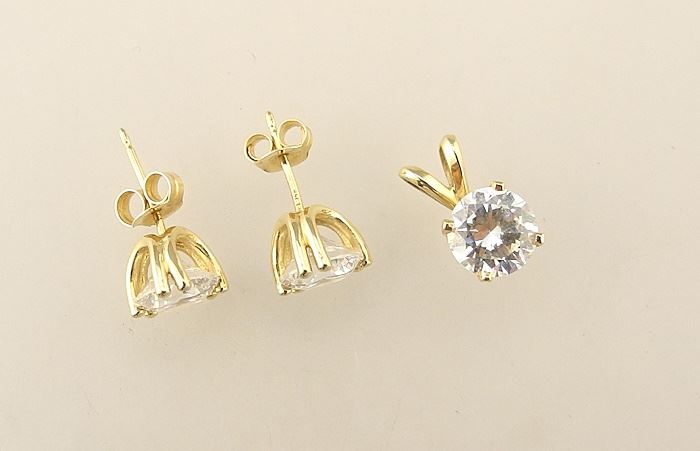LOT 251 14K Gold & Cubic Zirconia Pendant & Earrings. Estimate: $150 - $300 Auction Date: Tuesday, June 18 2024 at 4:00 PM