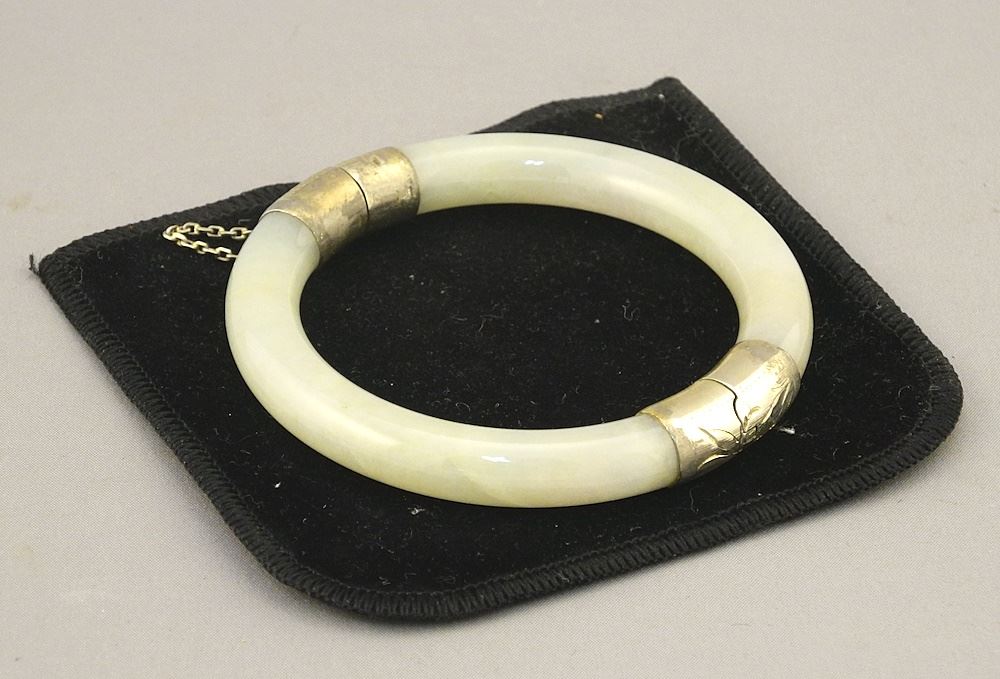 LOT 180 Jade Hinged Bangle, 2 13/16" Diameter. Estimate: $60 - $100 Sold For: $70 Auction Date: Tuesday, June 18 2024 at 4:00 PM