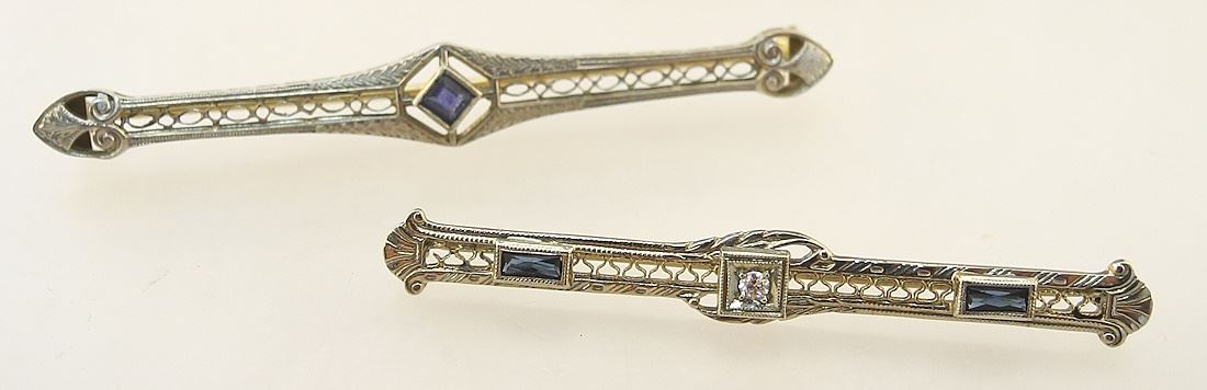 LOT 134 2 White Gold (marked 14K & 10K) Bar Brooches, 2" & 2 3/8"L, TW 6.7g with Box. Estimate: $200 - $300 Sold For: $180 Auction Date: Tuesday, June 18 2024 at 4:00 PM