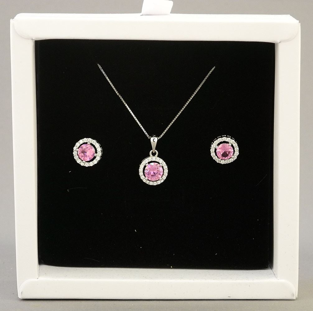 Sterling Silver with White Gold Overlay Lab Grown Pink Sapphire Halo Necklace & Earrings.