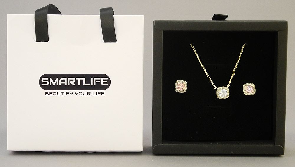 14K Gold Plated 2 Piece Lab Grown Diamond Halo Necklace & Lab Grown Pink Sapphire Earrings.
