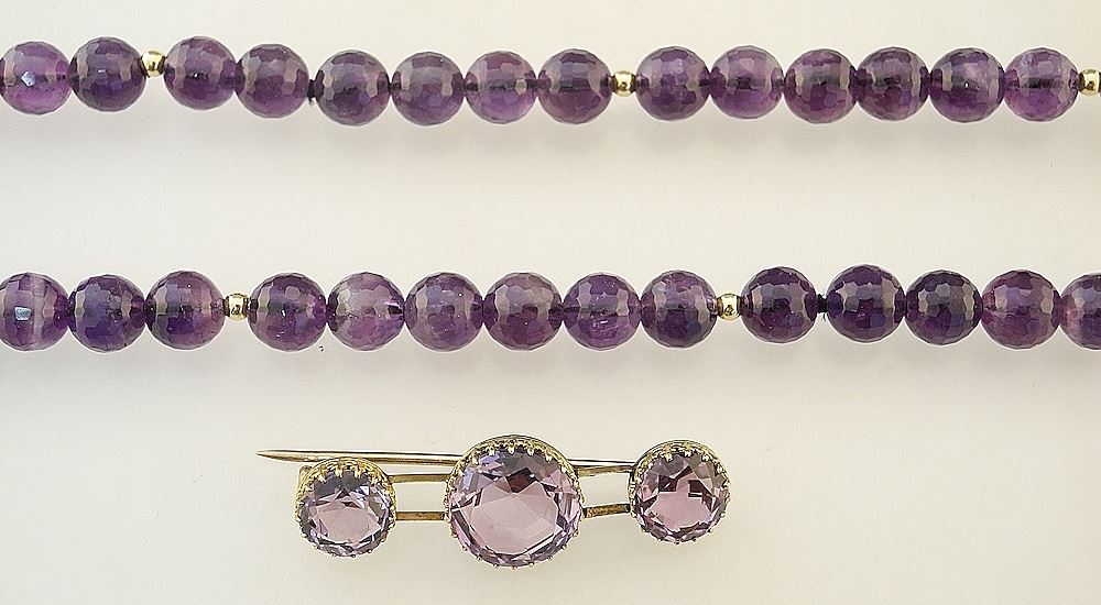 LOT 231 Collection of Amethyst Jewelry: 2 Rings (Size 9 & 9 1/4) / Bar Brooch / Necklace w/14K Cl Estimate: $100 - $150 Sold For: $110 Auction Date: Tuesday, June 18 2024 at 4:00 PM