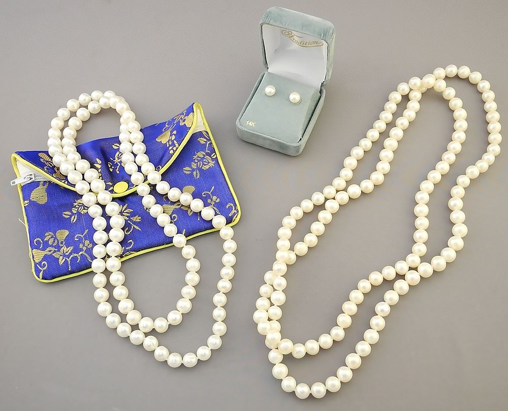 2 Freshwater Pearl Necklaces (9mm uniform, 42" & 34"L) & Pair of Earrings with Pouch.