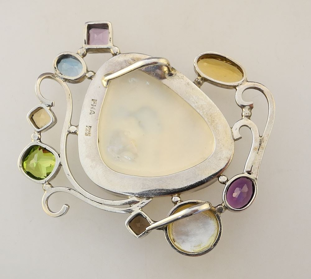 LOT 237 Custom Design Silver (marked 925) Brooch with Mother of Pearl / Mabe Pearl / Semi-Precious Gem Estimate: $80 - $120 Sold For: $130 Auction Date: Tuesday, June 18 2024 at 4:00 PM
