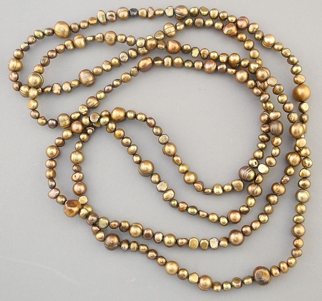 LOT 228 Collection of Chocolate Pearls: Necklace (62"L) & 3 Bracelets. Estimate: $60 - $100 Sold For: $45 Auction Date: Tuesday, June 18 2024 at 4:00 PM