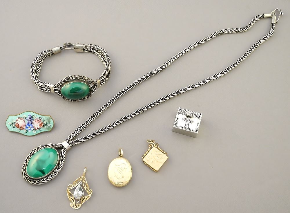 LOT 221 Jewel Box with Malachite Necklace & Bracelet & Sundry Items. Estimate: $60 - $100 Sold For: $120 Auction Date: Tuesday, June 18 2024 at 4:00 PM