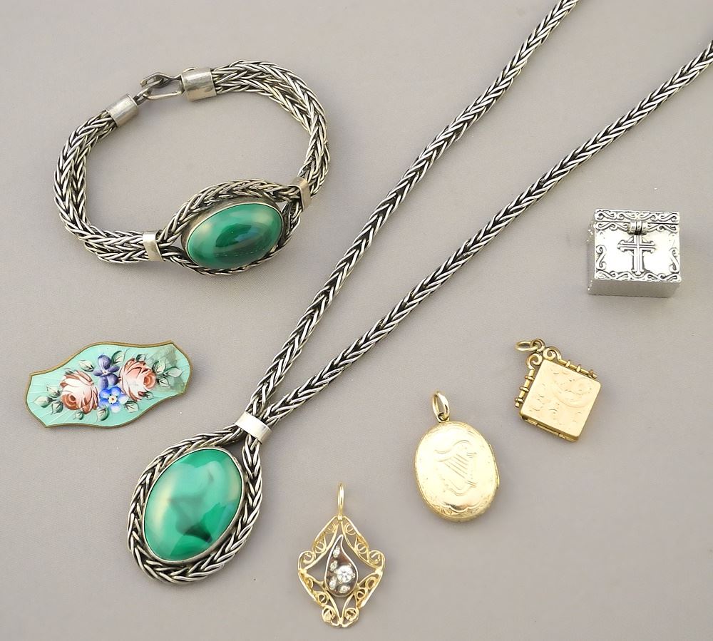 LOT 221 Jewel Box with Malachite Necklace & Bracelet & Sundry Items. Estimate: $60 - $100 Sold For: $120 Auction Date: Tuesday, June 18 2024 at 4:00 PM