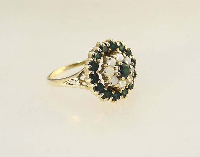 LOT 54 14K (unmarked) Yellow Gold Emerald & Pearl Cocktail Ring, Size 7 1/4, 4.3g. Estimate: $200 - $300 Sold For: $250 Auction Date: Tuesday, June 18 2024 at 4:00 PM