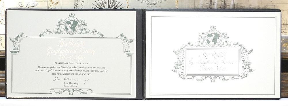 LOT 41 The Royal Geographical Society Silver Map, 14 1/2" x 22" with Certificate. Estimate: $100 - $200 Sold For: $160 Auction Date: Tuesday, June 18 2024 at 4:00 PM