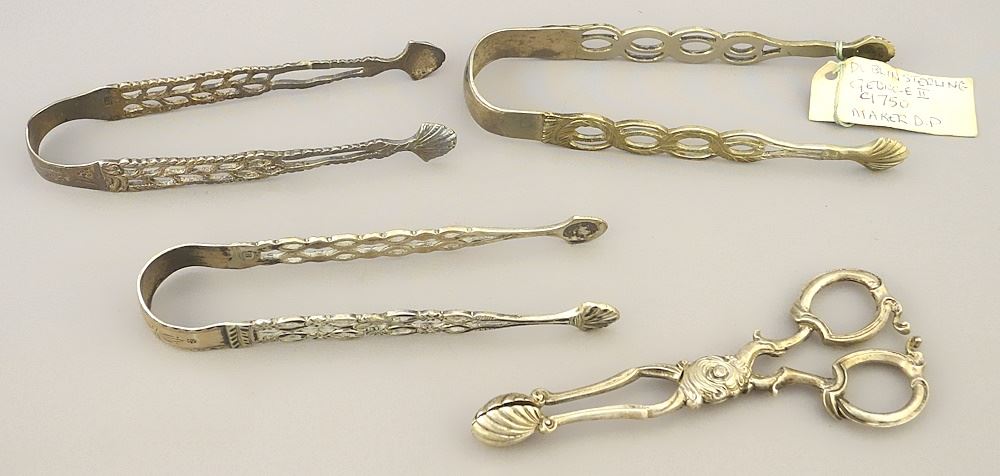 LOT 241 Collection of Silver (marked) Tongs & Nips, 191g, 5 1/4" - 5 3/8"L. Estimate: $140 - $180 Sold For: $150 Auction Date: Tuesday, June 18 2024 at 4:00 PM