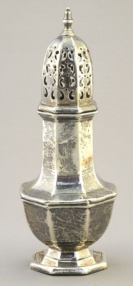 LOT 4 Harrod's London Hallmarked Silver Caster, 6 1/4"h, 94g (foot rim bent) Estimate: $60 - $100 Sold For: $80 Auction Date: Tuesday, June 18 2024 at 4:00 PM
