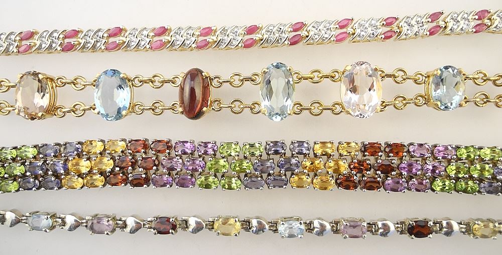Sterling Silver (marked) & 1 Gold- Tone Multi & Semi-Precious Bracelets Approx. 7"L, 77g.