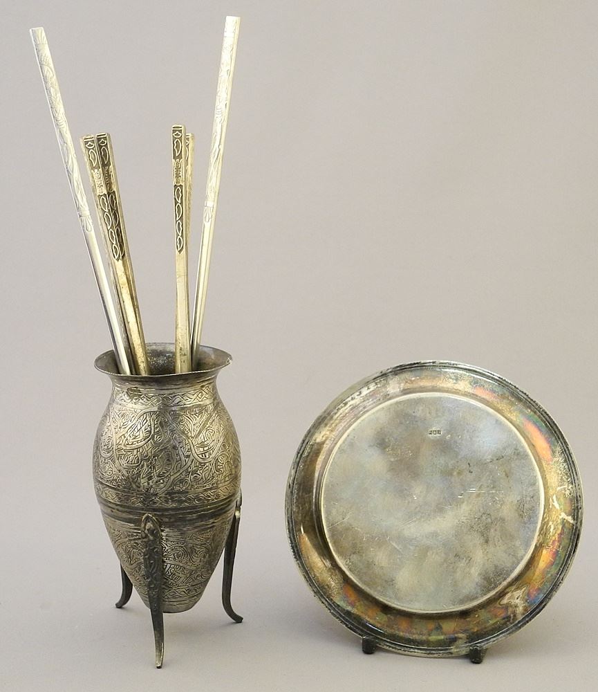 3 Pieces of Egyptian Silver (marked) , 157g with 7 Silver Plated Chopsticks, 7 1/4" - 9"L.