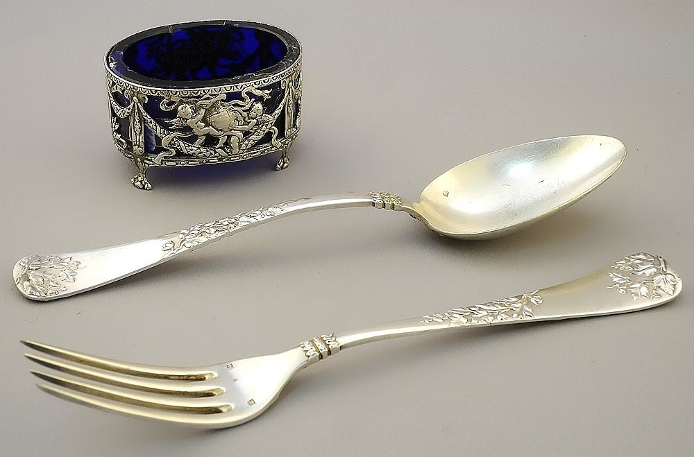 French 18th C. Hallmarked Open Salt with Antique French Silver Plated Serving Pieces (liner rest