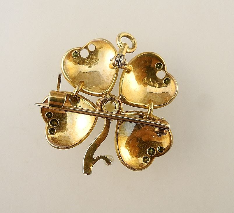 LOT 56 14K (marked) Yellow Gold Seed Pearl & Green Stone Brooch / Pendant, 1"h, 6.48g. Estimate: $160 - $225 Sold For: $325 Auction Date: Tuesday, August 13 2024 at 4:00 PM