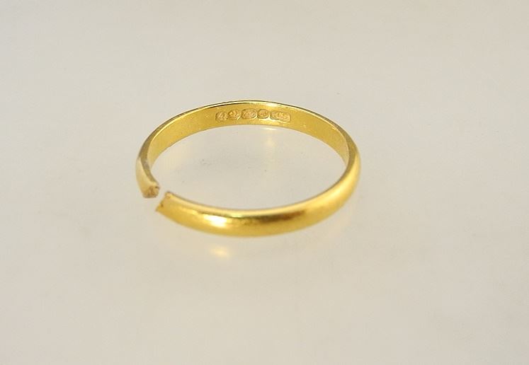 LOT 202 22K Hallmarked Yellow Gold Band, Shank Cut, Approximate Size 6 1/2, 2.89g. Estimate: $200 - $300 Sold For: $250 Auction Date: Tuesday, August 13 2024 at 4:00 PM
