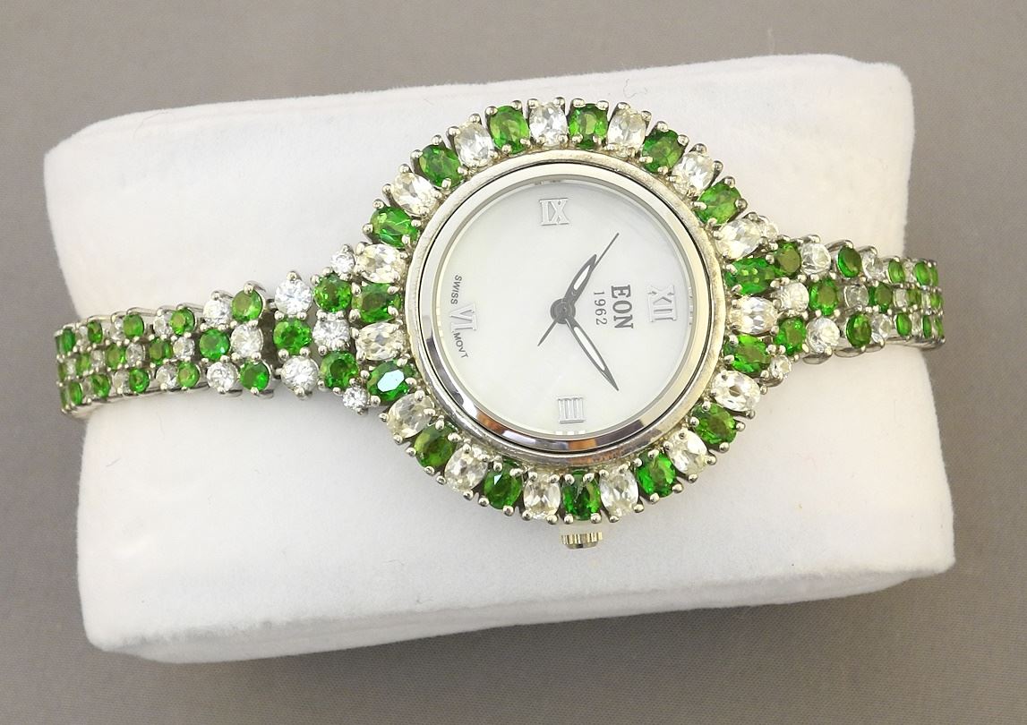 EON 1962 Sterling Silver Chrome Diopside & White Zircon Wristwatch, 43g.