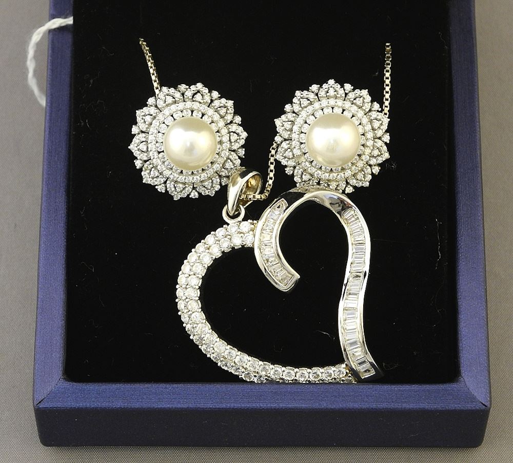 LOT 167 Sterling Silver CZ Necklace with Pendant & South Sea Pearl & Lab Grown Diamond Earrings. Estimate: $60 - $80 Auction Date: Tuesday, August 13 2024 at 4:00 PM