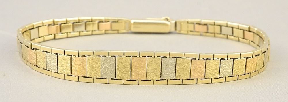 LOT 20A 14K (marked) Vari-Gold Bracelet, 7 1/4"L, 16.8g. Estimate: $500 - $600 Sold For: $850 Auction Date: Tuesday, August 13 2024 at 4:00 PM