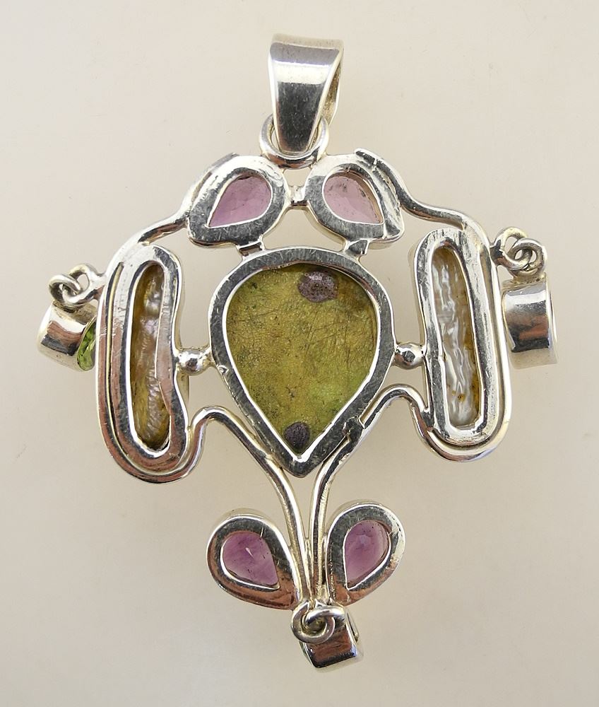 Artisan Silver (unmarked) Pendant with Amethyst / Peridot / Freshwater Pearl, 22.58g, 2 3/4"h.