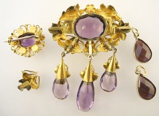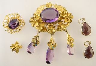 LOT 15 4 Victorian Gold Tone Metal & Amethyst Jewelry Items (with loose section), 16.5g. Estimate: $120 - $180 Sold For: $650 Auction Date: Tuesday, August 13 2024 at 4:00 PM