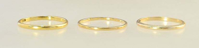 Three Gold Bands: 14K (Size 6, 1.23g ) / 18K (Size 6 1/2, .99g) / 22K (Size 6 1/2, 1.58g).