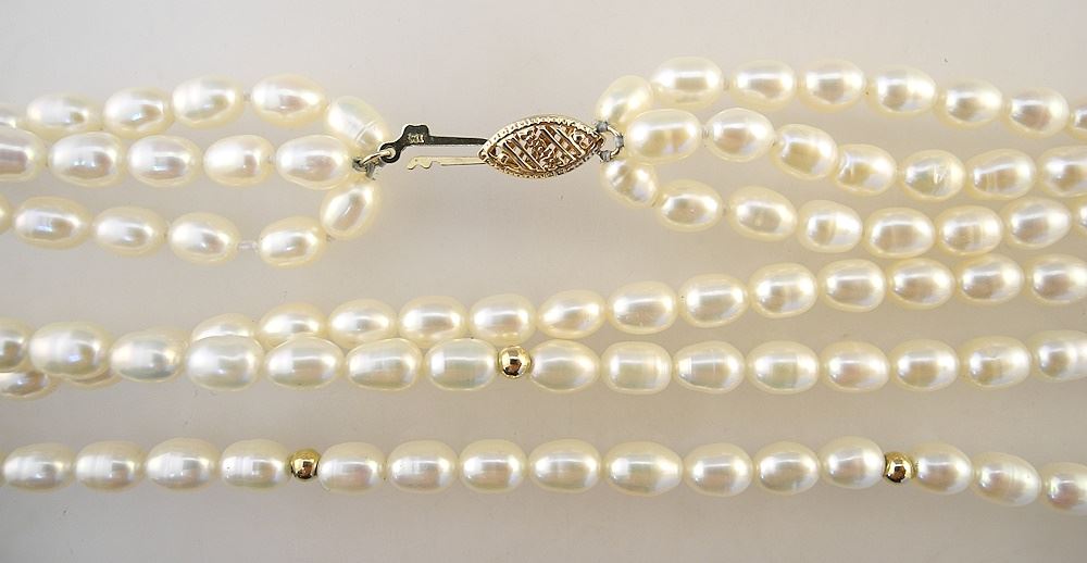Triple Strand Pearl Necklace with 14K (marked) Gold Clasp & Gold Tone Spacers, 18"L.