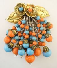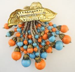 LOT 237 Turquoise & Coral Glass Gilt Metal Brooch, 3"h with Box. Estimate: $60 - $100 Sold For: $70 Auction Date: Tuesday, August 13 2024 at 4:00 PM