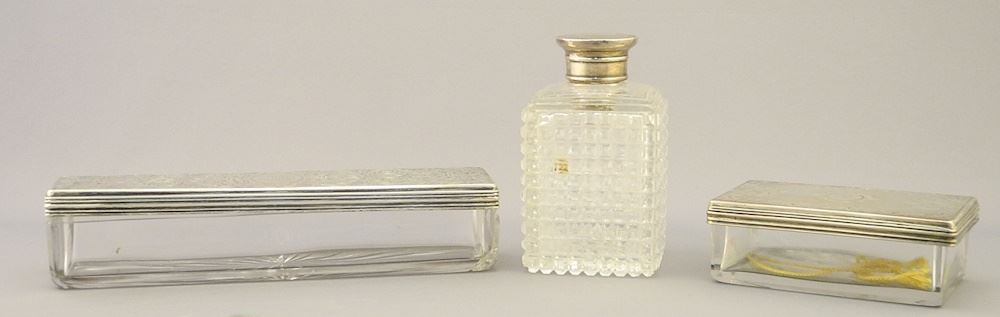 LOT 132 3 Hallmarked Silver Dresser Jars: JH / London, 3 5/8"h, 121g (glass damaged). Estimate: $80 - $100 Sold For: $80 Auction Date: Tuesday, August 13 2024 at 4:00 PM