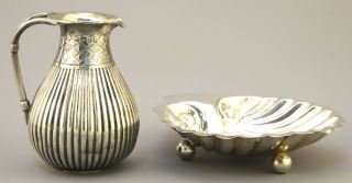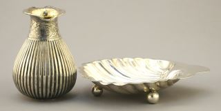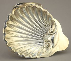 LOT 169 2 Hallmarked Silver Items: Juglet & Butter Shell, 1" & 3 1/8"h, TW 154g. Estimate: $100 - $150 Sold For: $115 Auction Date: Tuesday, August 13 2024 at 4:00 PM