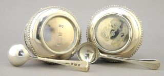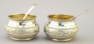 Pair of Parcel Gilt Hallmarked Open Salts: WH / London / 1875 + 2 Spoons , 94g.