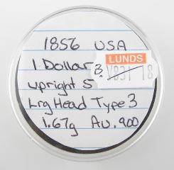 LOT 258 USA 1856 .900 $1 Gold Coin. Estimate: $150 - $200 Sold For: $190 Auction Date: Tuesday, February 11 2025 at 4:00 PM