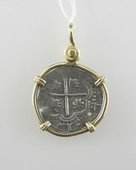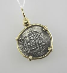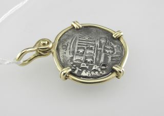 LOT 267 Atocha Shipwreck Replica Spanish 2 Reales Silver Coin in (tested 10K) Surround, 6.8g. Estimate: $200 - $300 Sold For: $1,300 Auction Date: Tuesday, February 11 2025 at 4:00 PM