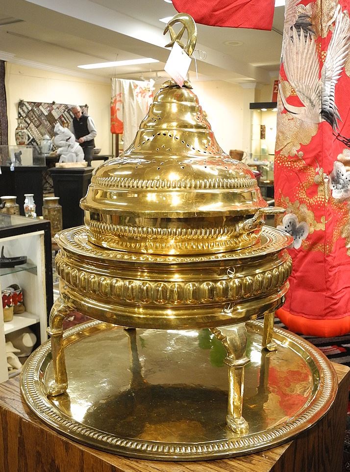 LOT 277 Egyptian Brass Brazier on Stand, 23 x 21 1/2" Diameter. Estimate: $100 - $200 Auction Date: Tuesday, February 11 2025 at 4:00 PM
