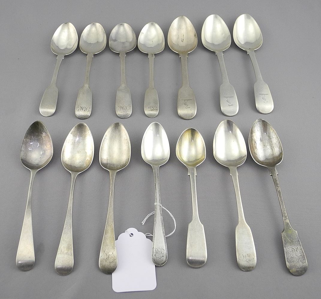 Fourteen Various Georgian Silver Teaspoons, 255g.