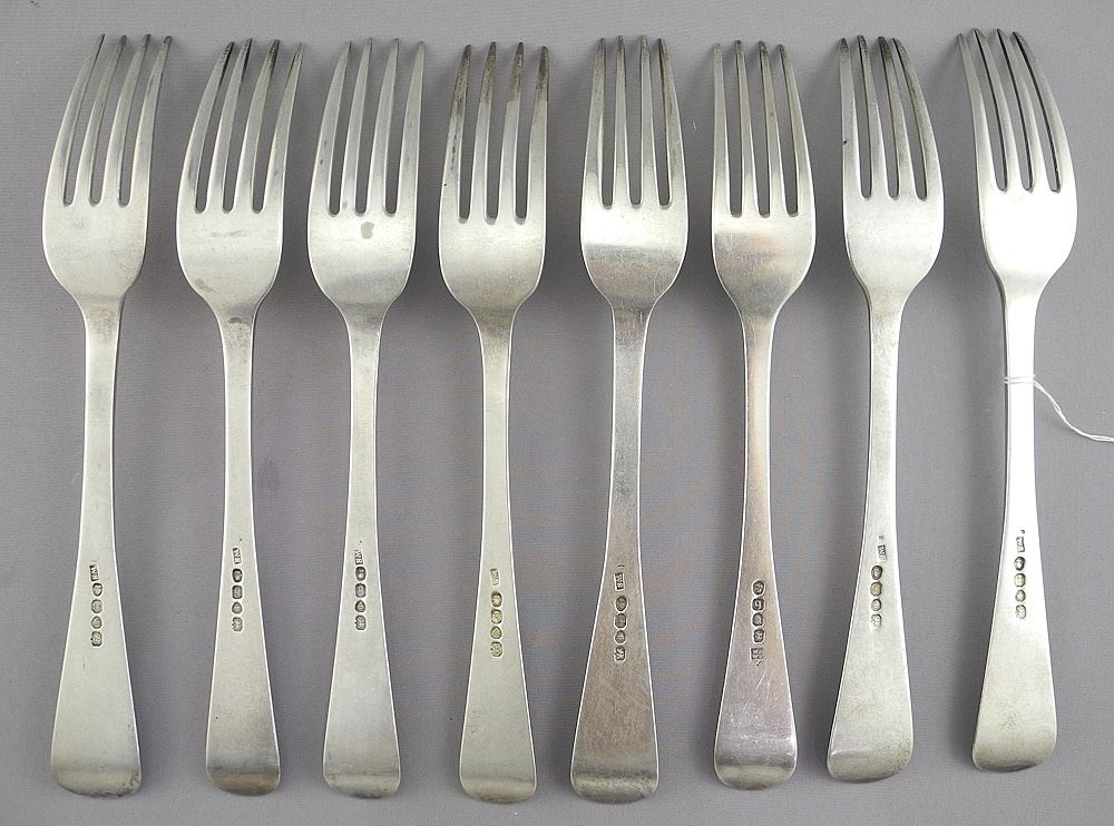 Eight Georgian Silver Forks (7+1), 8"L, 528g.