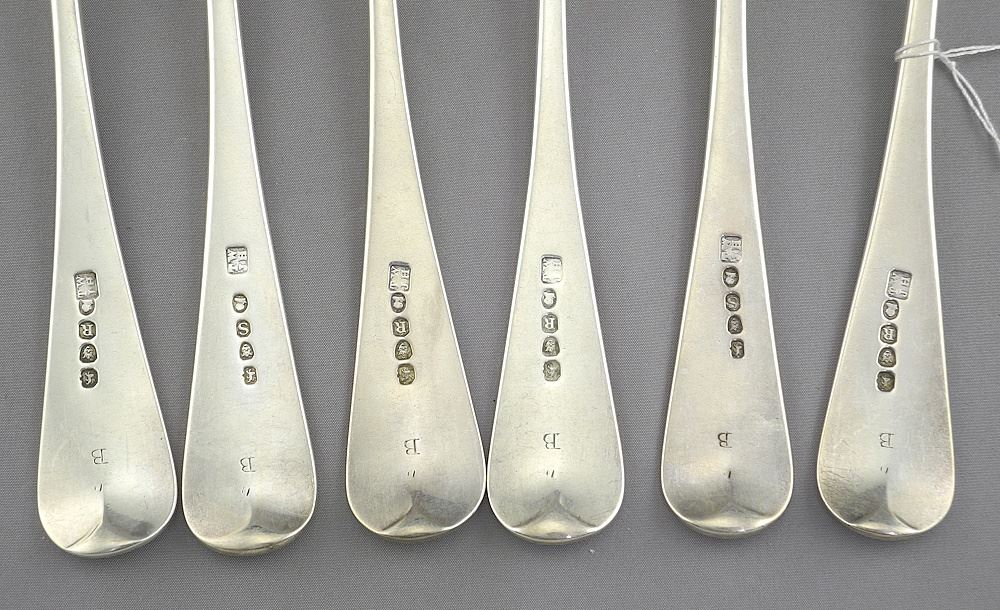 Six Georgian Silver Forks Monogrammed 'B', 8"L, 415g.