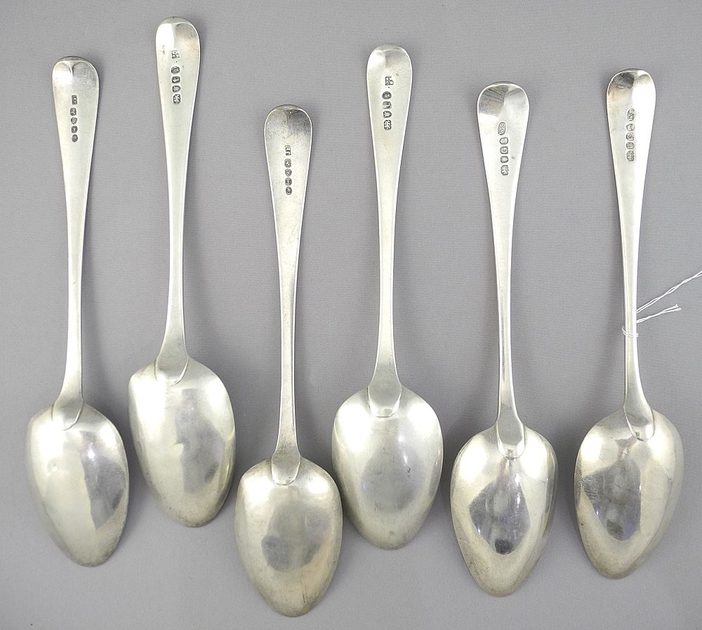 Six Various Georgian Silver Table Spoons, 9"L, 363g.