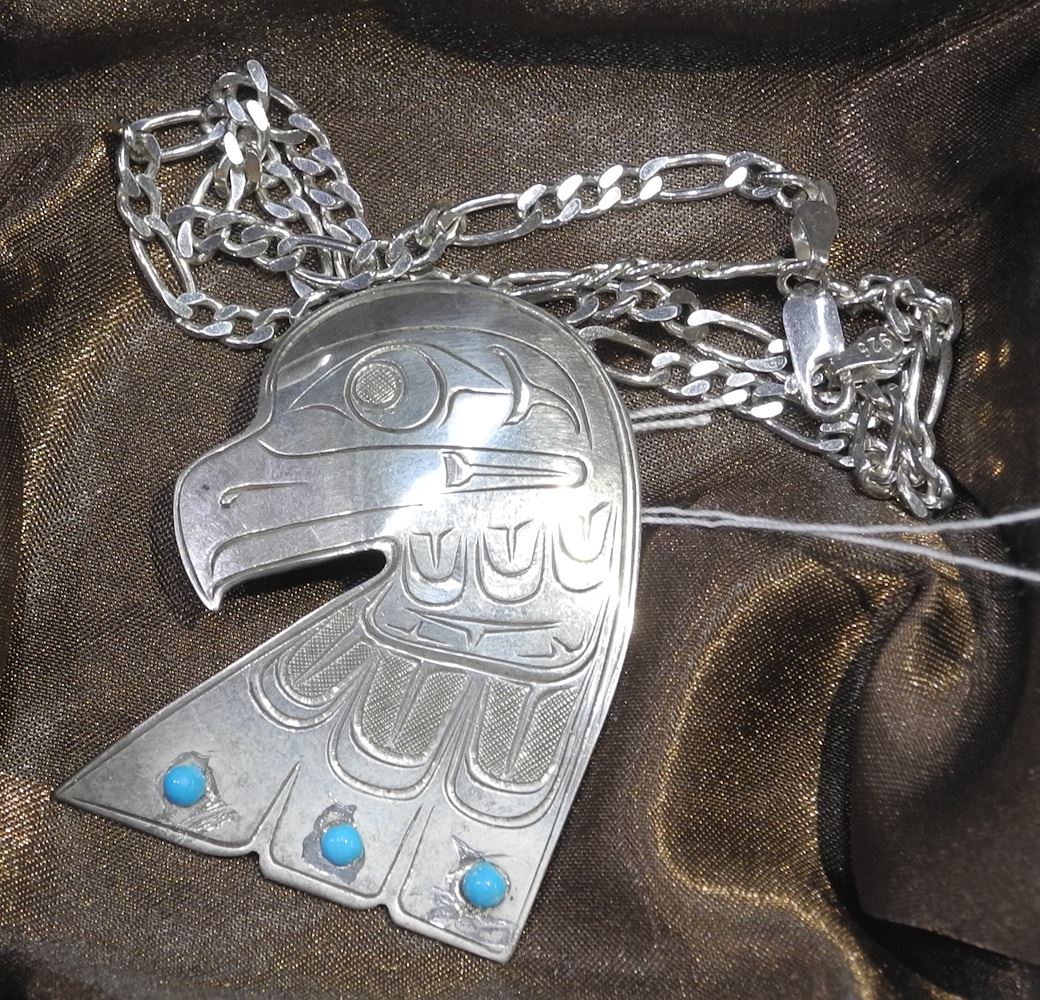 LOT 339 Northwest Coast Eagle Pendant on Italian Silver Chain, 2"h / 19"L / 24.8g. Estimate: $200 - $250 Auction Date: Tuesday, February 11 2025 at 4:00 PM