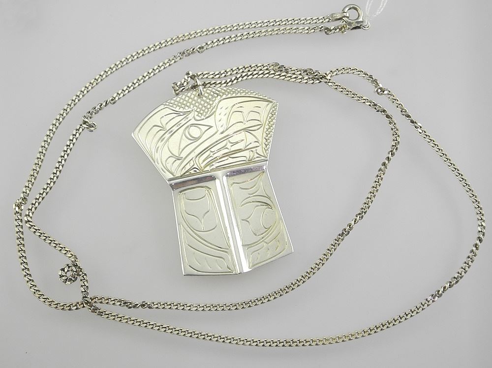 Kwagiulth Silver "Copper" Pendant Monogrammed ND (Nancy Dawson) on 28" Chain (925), TW 21.5g.