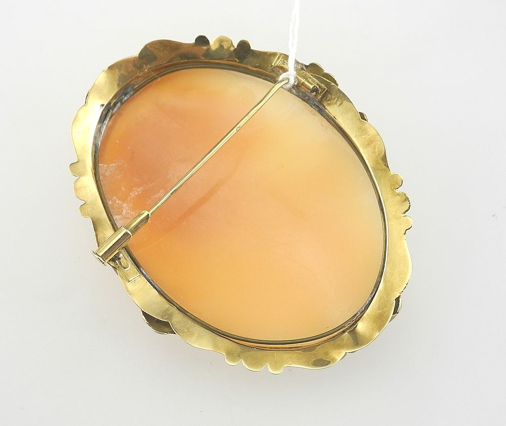 LOT 170 Rose & Cream Cameo Brooch with Gold Tone Surround, 2 1/4" x 2". Estimate: $80 - $120 Sold For: $80 Auction Date: Tuesday, February 11 2025 at 4:00 PM